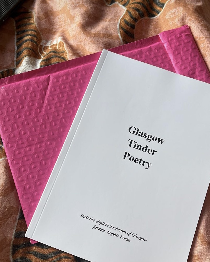 ‘Glasgow Tinder Poetry’ (2023) is a book made from real Glaswegian tinder bios, converted into a free verse poetry layout. all profits from the books went to the brilliant refuweegee, a charity which welcomes refugees into scotland.